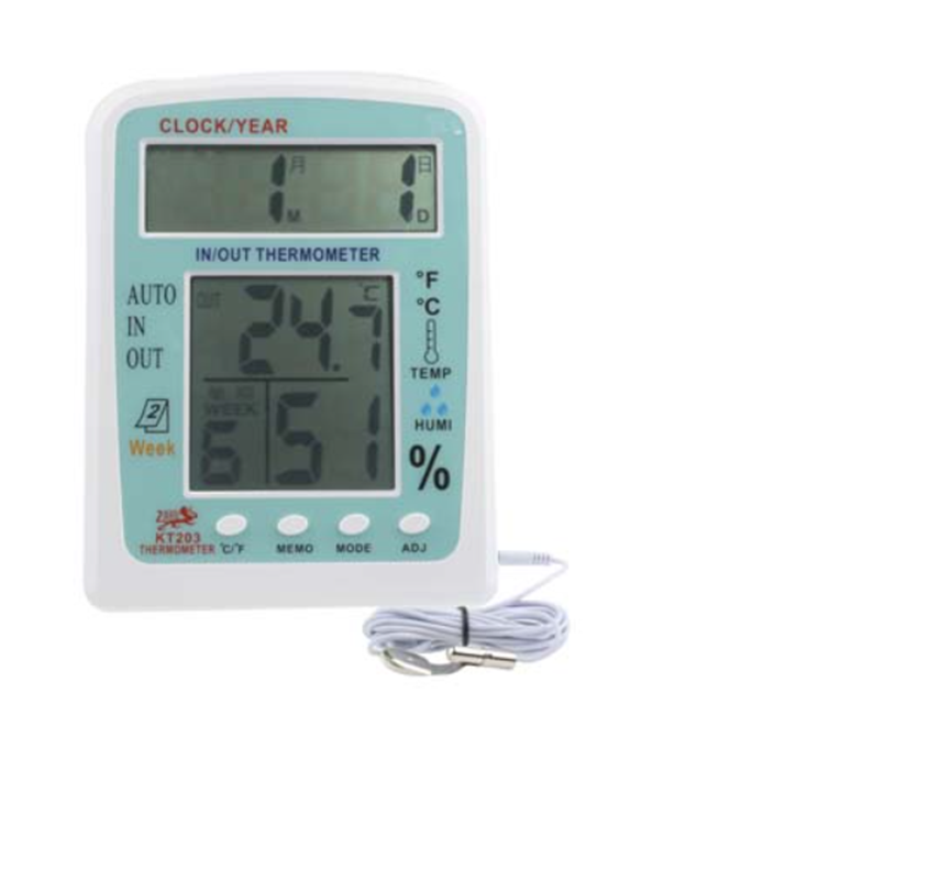 Description: 2 LCD Screen Display Indoor/Outdoor Thermohygrometer KT203 – Precision Temperature & Humidity Monitoring Ensure optimal comfort and precise environmental control with the KT203 Indoor/Outdoor Thermohygrometer. This sophisticated device offers reliable, accurate readings of temperature and humidity, ideal for a wide range of applications and environments. Designed for both indoor and outdoor use, the KT203 provides comprehensive data gathering, contributing to enhanced comfort, effective climate control, and informed decision-making. Key Features & Specifications: Dual Display Technology: The KT203 boasts a dual LCD screen display, offering clear and easily readable temperature and humidity readings. One screen is designed for direct visual examination, while the other displays detailed data and allows for easy comparison. Accurate Temperature Readings: Utilizing advanced sensor technology, the KT203 delivers precise temperature measurements with minimal error. It’s calibrated for a wide range of temperatures, ensuring reliable results across diverse climates. Precise Humidity Monitoring: Alongside temperature, the device meticulously measures humidity levels, providing a complete picture of air quality. The humidity readings are also displayed on the dual LCD screen for quick and convenient assessment. Wide Temperature Range: The KT203 is capable of handling temperature fluctuations up to [Specify Temperature Range – e.g., 10°C to 40°C]. This broad range makes it suitable for various environments, from residential areas to industrial facilities. Outdoor Mode: Specifically designed for outdoor use, the KT203 incorporates robust features to withstand harsh weather conditions. It features a durable, weatherproof design and is resistant to rain and wind. Indoor Mode: The device’s simple and clear design makes it perfectly suited for indoor applications, providing accurate readings in living spaces, offices, and more. Intuitive LCD Display: The LCD screen displays temperature, humidity, and date/time in a user-friendly format. The display is designed for easy viewing, even in bright sunlight. Long Battery Life: The KT203 is powered by a long-lasting battery, allowing for extended operation without frequent replacements. This ensures consistent data collection and minimal maintenance. Compact & Portable: The device is designed to be easily transported, making it ideal for field use, inspections, and monitoring. Its compact size allows for convenient placement and operation. Reliable & Durable: Built with high-quality components, the KT203 is engineered for long-term performance and reliability. It’s a dependable investment for any application requiring accurate temperature and humidity readings. Simple Installation: The KT203 is designed for straightforward installation, simplifying setup and ensuring accurate readings. Suitable for Various Applications: This device is ideal for a diverse range of applications, including: Residential Climatic Monitoring: Monitor indoor temperature and humidity for comfort and energy efficiency. Commercial Building Management: Track environmental conditions in office spaces, retail locations, and other commercial buildings. Agricultural Monitoring: Ensure optimal growing conditions by monitoring temperature and humidity levels. Environmental Monitoring: Collect data for environmental research and analysis. Industrial Process Control: Monitor and regulate temperature and humidity within industrial settings. Technical Specifications: Display Type: Dual LCD Display Size: [Specify Size – e.g., 4 inches] Display Resolution: [Specify Resolution – e.g., 128×64] Temperature Range: [Specify Range – e.g., -10°C to 50°C] Humidity Range: [Specify Range – e.g., 20% to 80% RH] Operating Temperature: [Specify Operating Temperature – e.g., -20°C to 60°C] Operating Humidity: [Specify Operating Humidity – e.g., 50% to 95% RH] Battery Life: [Specify Battery Life – e.g., 6 months] Power Source: [Specify Power Source – e.g., 3 x AAA batteries] Material: [Specify Material – e.g., ABS Plastic] Order Your KT203 Today and Experience Precise Environmental Control!
