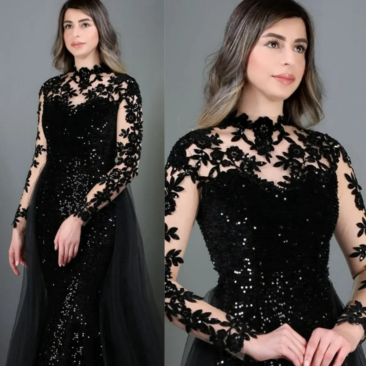 2025 Mother of the Bride Dresses With Detachable Train Formal Evening Gowns Sequined Lace High Neck Beaded Lace Party Wear