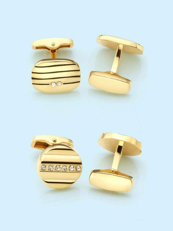 2pairs Round & Square Cufflinks With Adhesive Rhinestones For Business, Work, Wedding Gift