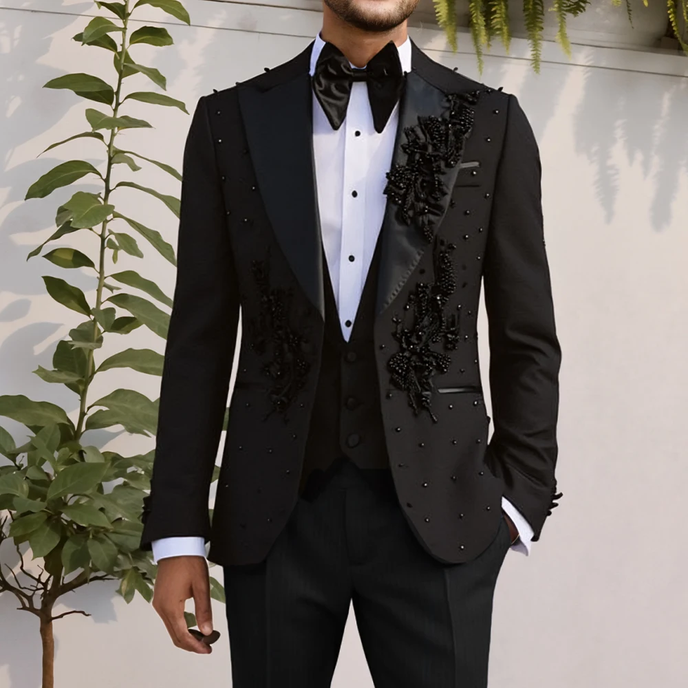 3 Piece Mens Tuxedo Suit Set Handmade Beads Customized Slim Fit Groom Fashion Wedding Formal Tailored Wear Jacket Vest Pants