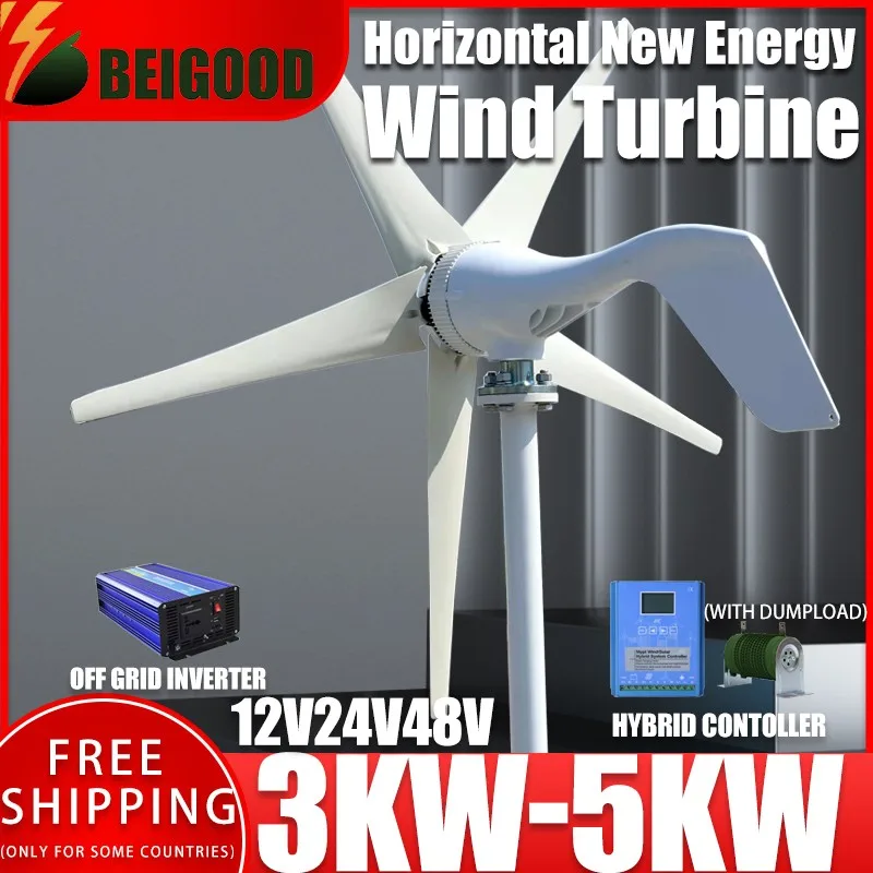 3000W 12V 24V 48V Horizontal Home Wind Turbine Free Energy 3 5 Blades Wind Generator Power Windmill With MPPT Hybrid Controller