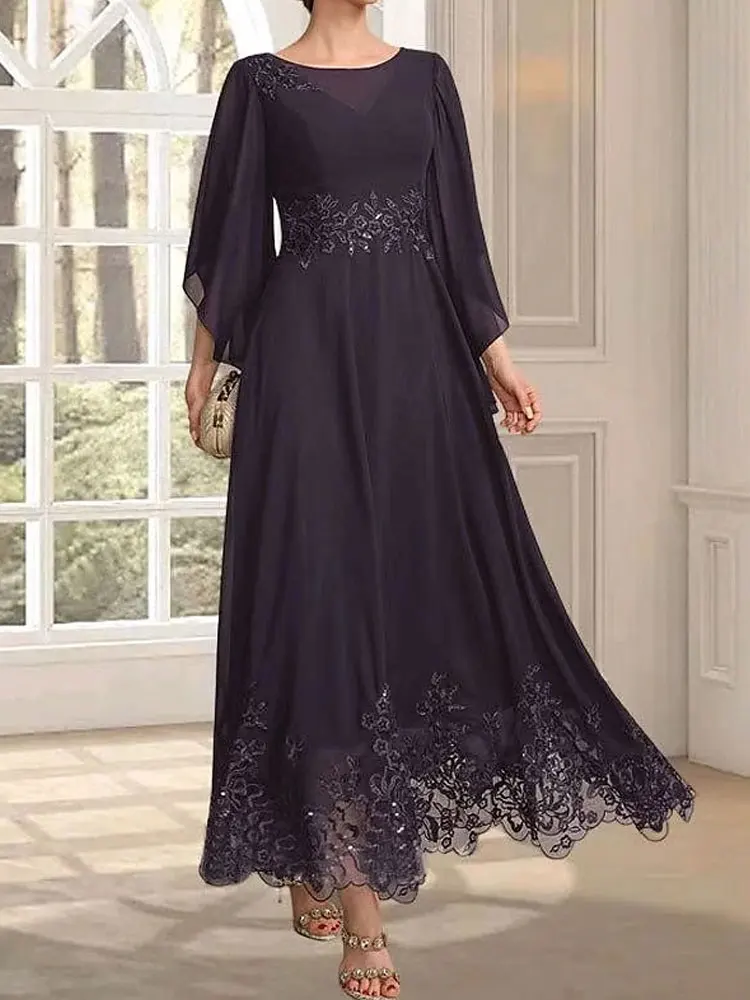 A-Line Evening Gown Wedding Guest Ankle Length 3/4 Sleeves Jewel Neck Chiffon with Ruched Sequin Appliques Dress 2024 Customized