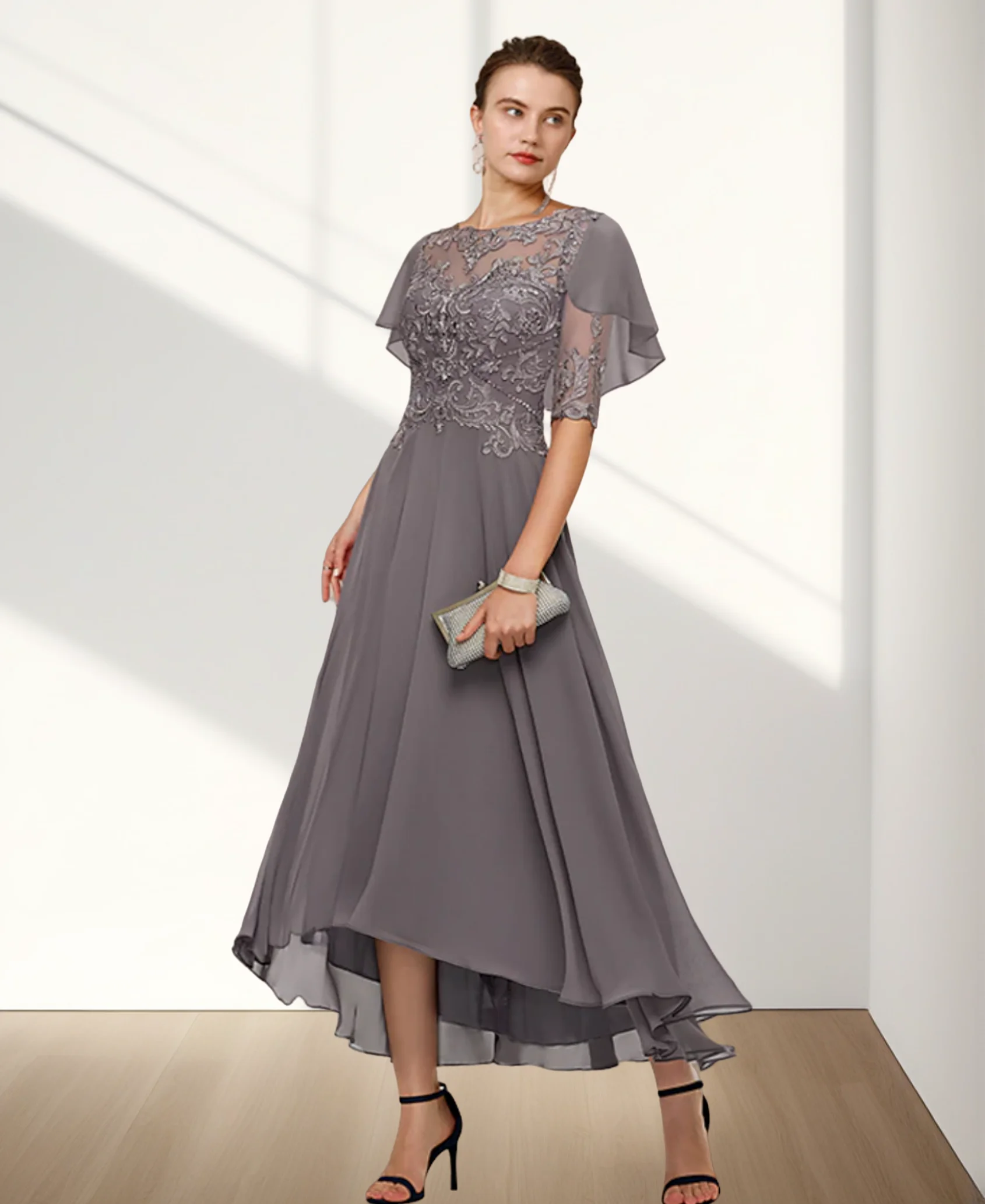 A-Line Mother of the Bride Dress Formal Wedding Guest Elegant Scoop Neck Asymmetrical Chiffon Half Sleeve with Appliques 2024