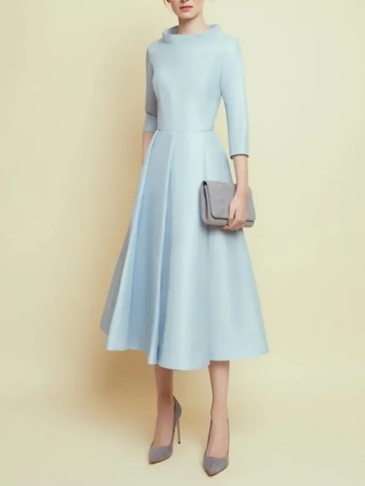 A-Line Simple Solid Color Tea-Length Three Quarter Bateau Neck Mother of the Bride Dress Wedding Guest