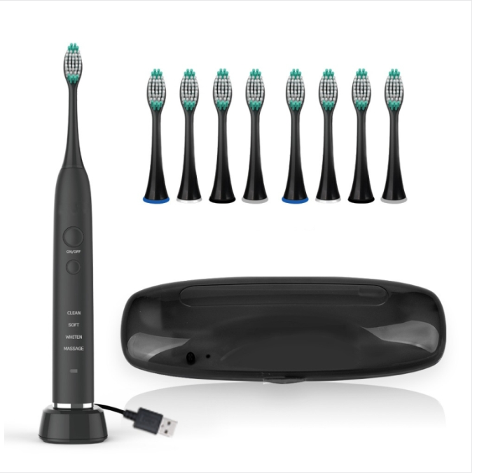 Adult electric Sonic toothbrush USB charging with 8 brush heads (black)