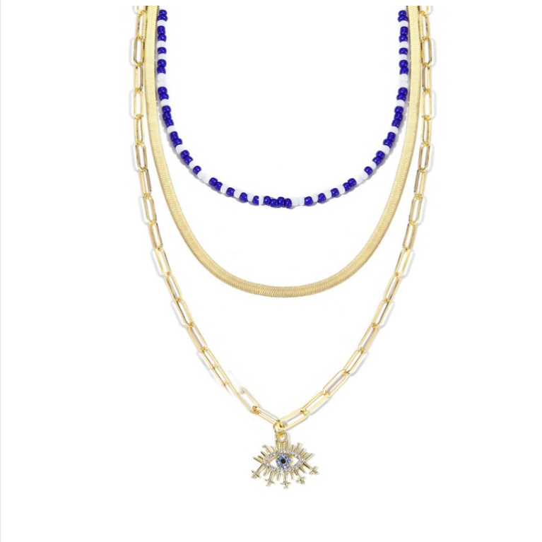 Angel Eye Pendant Multi-layer Necklace, Model: N2210-6 with Rice Bead Snake Chain in Three Layers