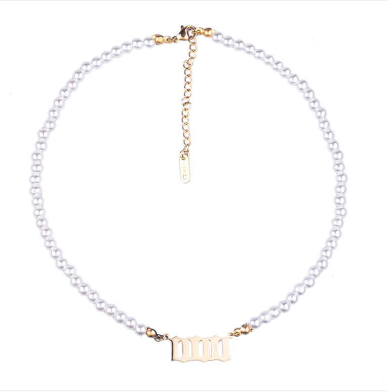 Angel Number Necklace with Pearl on Stainless Steel Choker (000 Gold Color)