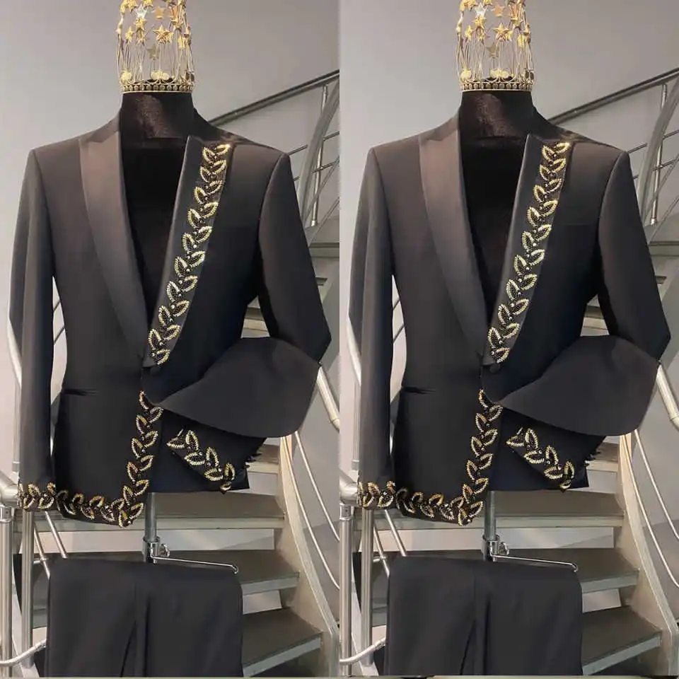Appliques Fashion Wedding Suits For Groom Peaked Lapel Single Breasted Tuxedos 2 Pcs Jacket Pants Party Prom Customized