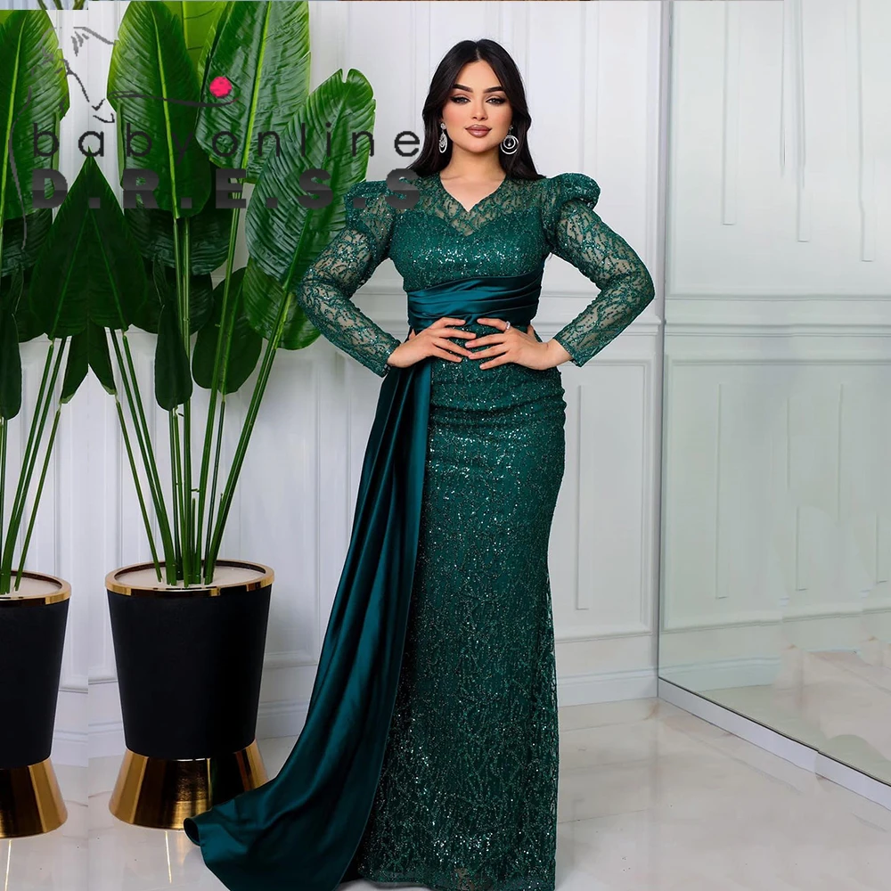 BABYONLINE Elegant Mother of Bride Dress Beaded Stones Sequins Full Sleeve Floor-length Satin Skirt Train Wedding Party Gown