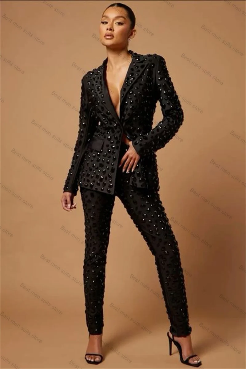 Black Crystals Women Suit Pants Set 2 Piece Blazer+Trousers Cotton Formal Office Lady Jacket Customized Prom Wedding Coat