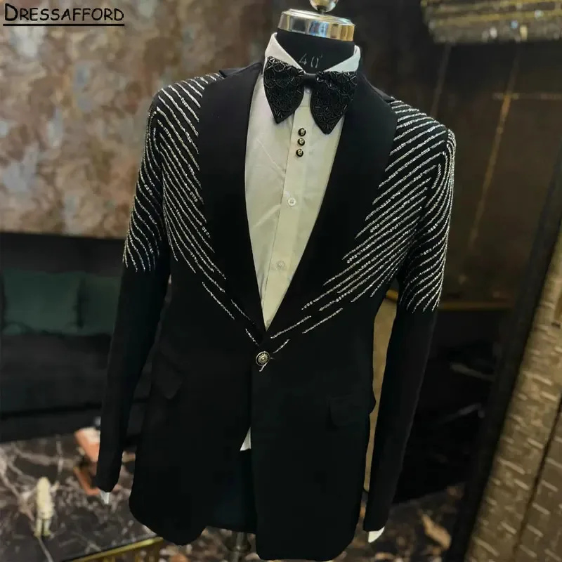 Black Formal Men Business Silver Crystal Occasion Tuxedos Grooms Wedding Party Prom Male Suit 2 Piece Set Blazer Pants