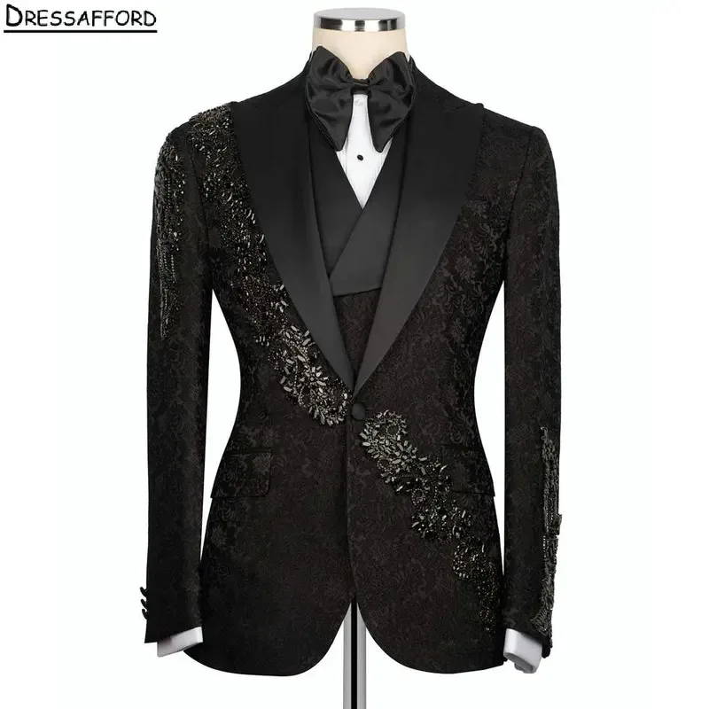 Black Jacquard Men Business Sequined Appliques Formal Occasion Tuxedos Grooms Wedding Party Prom Male Suit 2 Piece Blazer Pants