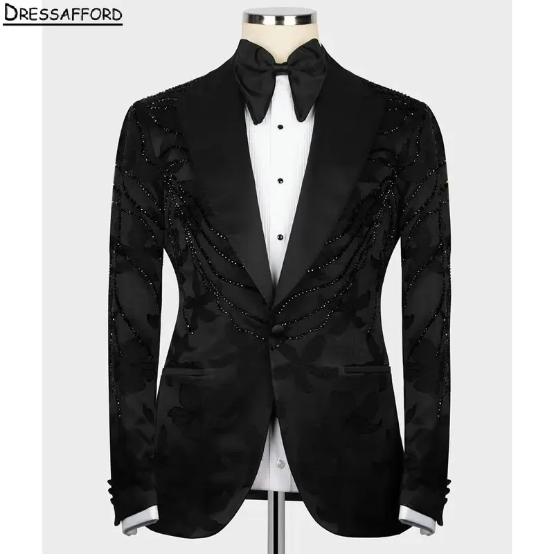 Black Men Business Beading Crystal Formal Occasion Tuxedos Grooms Wedding Party Prom Male Suit 2 Piece Set Blazer Pants