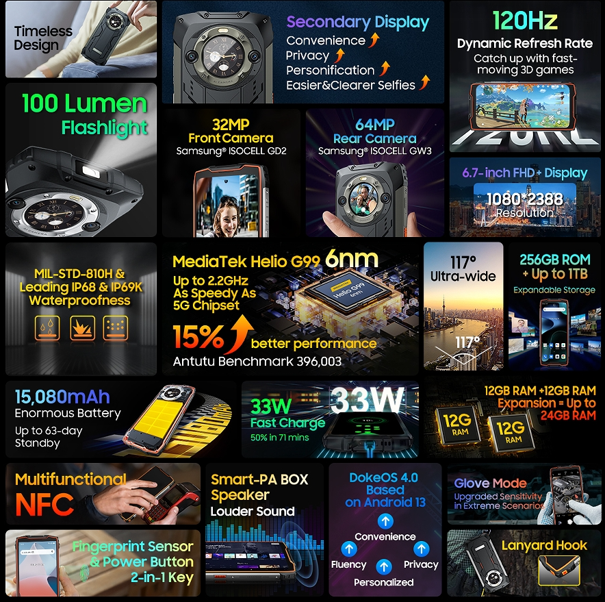 Blackview BV9300 Pro 6.7-Inch Main & 1.3-inch Round Secondary Display Built-in 100LM Flashlight 15080mAh 4G Ruggedized Smartphone