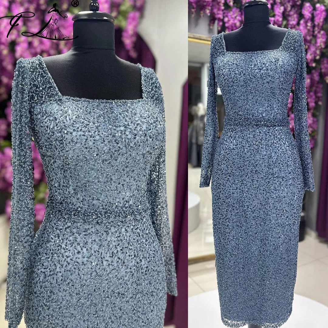 Blue Beaded Mother Of The Bride Dresses 2025 Square Neck Evening Dress Long Sleeves Robe Customized
