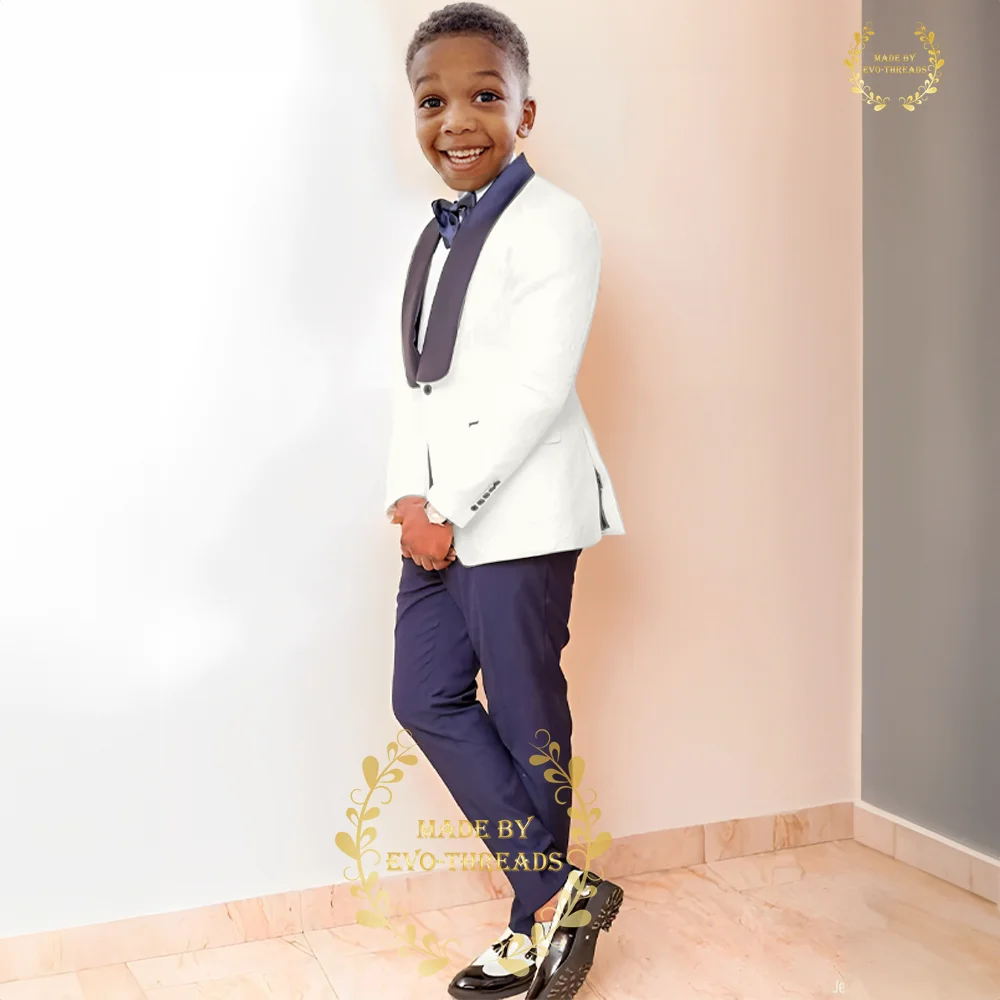 Boys Suit in White 2 PCS Jacket Pants Navy Blue Satin Shawl Lapel Slim Fit Blazer for Kids Custom Wedding Birthday Party Tuxedo
