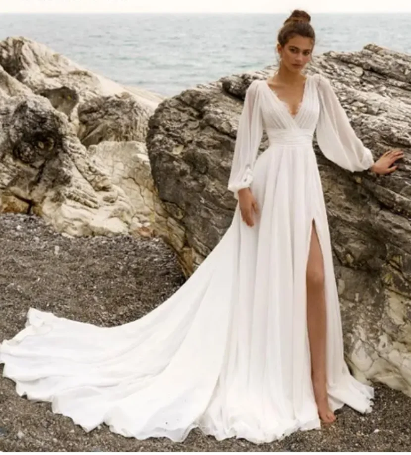 Bride Beach V-Neck Lace LaBoum Sexy High Split Wedding Dress Bridal Gowns Puff Sleeve Robe De Marié Evening Gown For Women