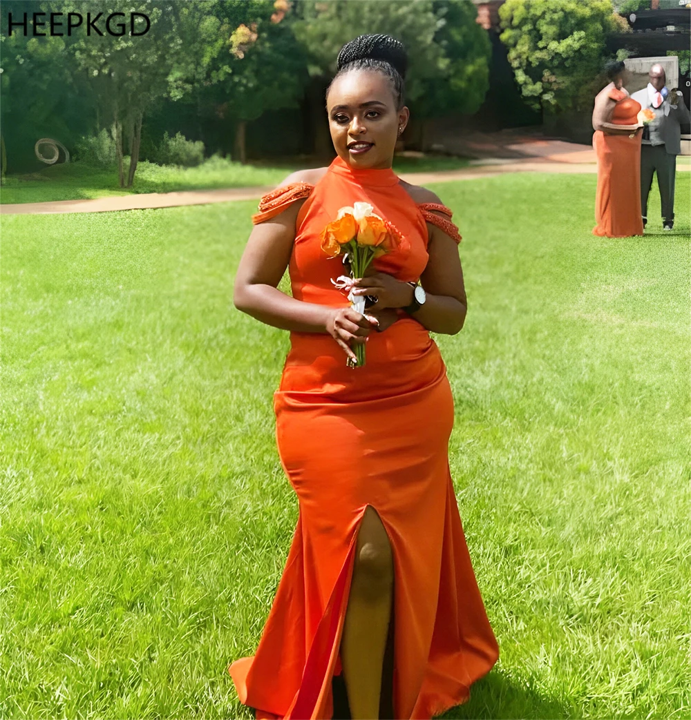 Burnt Orange African Bridesmaid Dresses 2025 High Neck Sequins Straps Shiny Satin Wedding Party Gowns Custom Made