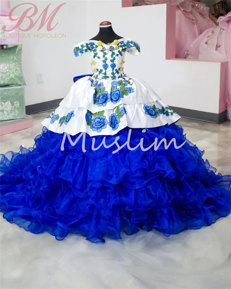 Charro Blue And White Flower Girls Dress 2025 With Flower Embroidery Vestido Mini Quinceañera Dress Tiered Birthday Customized