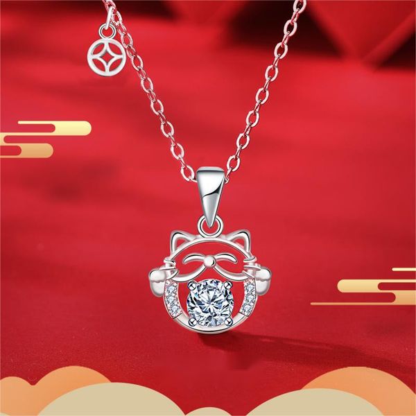 Chinese Style Necklace 925 Sterling Silver DIY Lucky Cat Moissanite Pendant