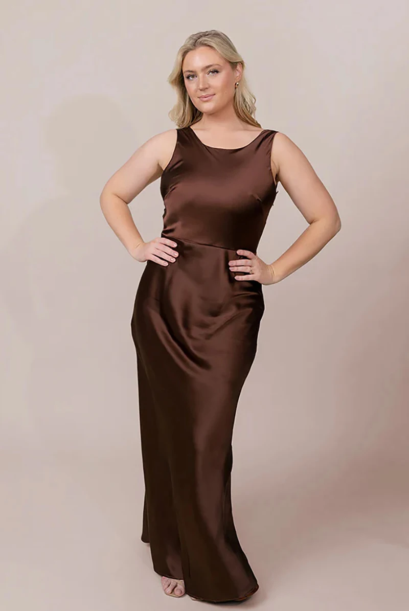 Chocolate Evening Dress O Neck Bridesmaid Dress Long Satin Sleeveless Wedding Party Dress Simple Backless Prom Dress Customized