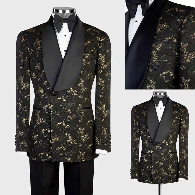 Classic Floral Jacquard Wedding Suits Double Breasted Groom Wear Shawl Lapel Tuxedos Business 2 Pcs Jacket Pants Customized