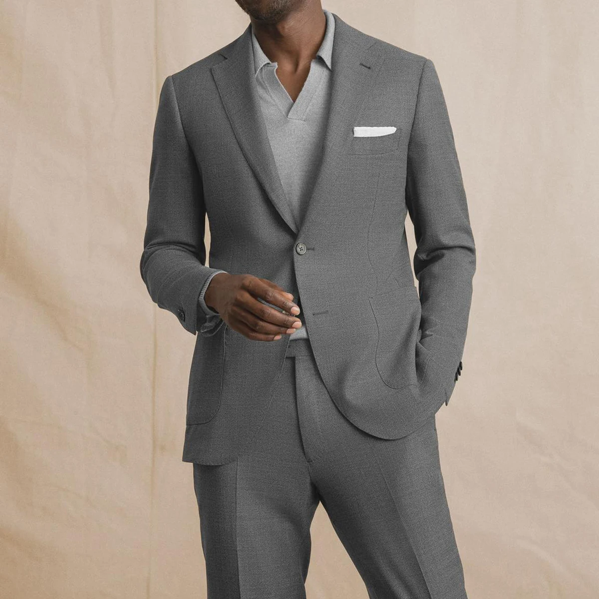 Classic Grey Men Suits Tuxedo Notched Lapel Two Buttons Big Pockets 2 Pieces Blazer Pants Tailored Formal Business Customized