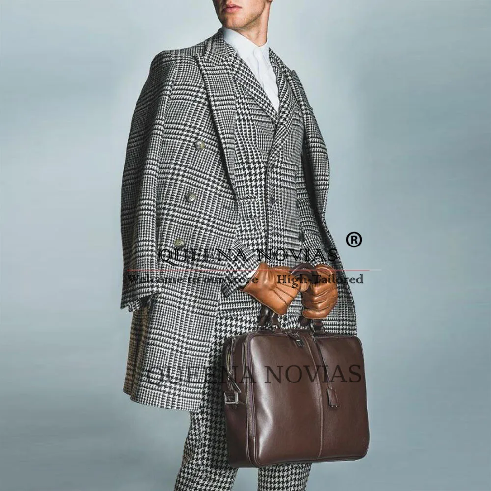Classic Houndstooth Business Suits Men Customized Coat Long 3 Pieces Prom Party Blazers Double Breasted Groom Wedding Tuxedos