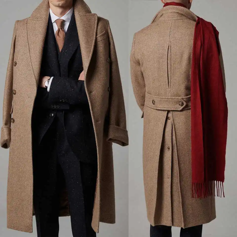 Classic Men Long Coat Herringbon Double Breasted Overcoat Wool Blends Winter Warm Plus Size Wedding Men Suits Customized