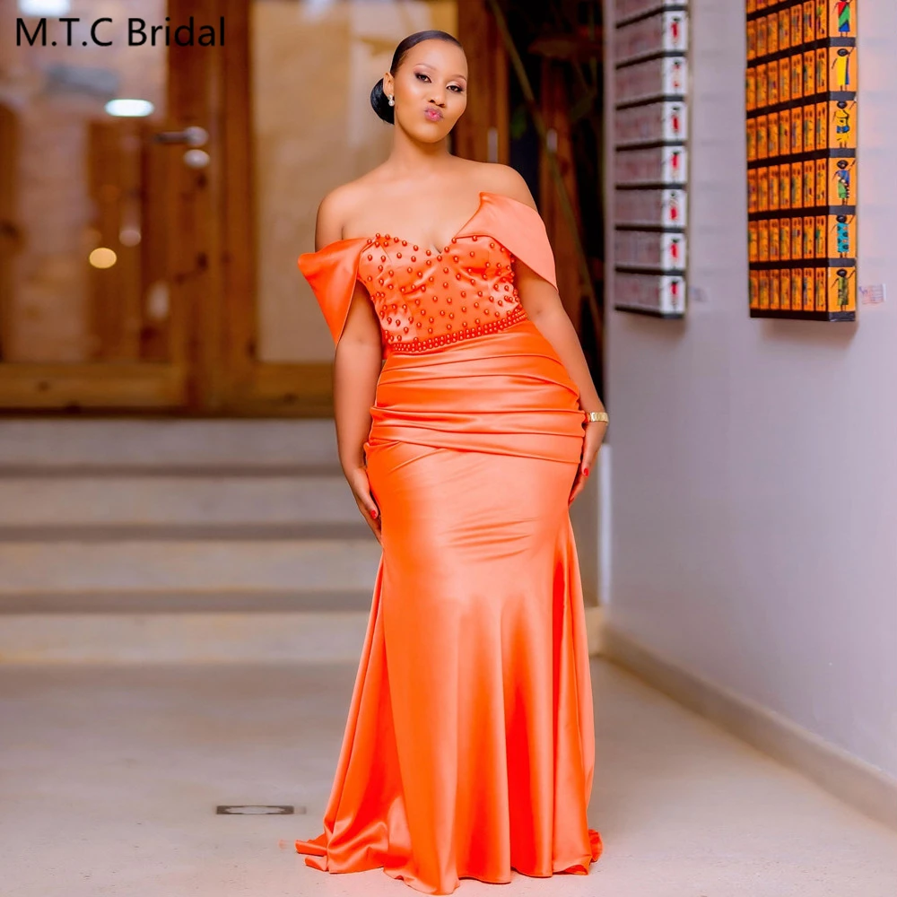 Custom Made Orange Mermaid Dress Bridesmaid 2024 Off The Shoulder Beads Satin Long African Women Wedding Party Gowns Wholesale