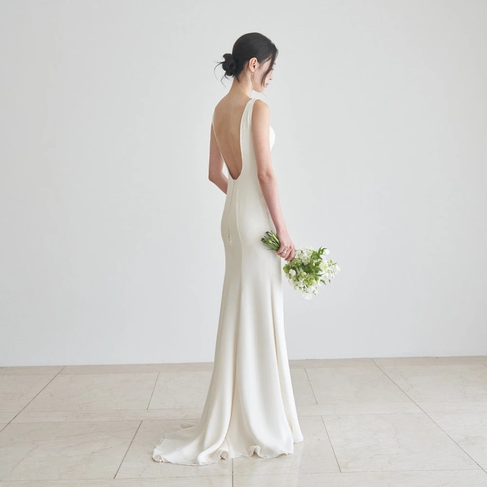 Item: Customized Elegant Merimaid Wedding Dress Boat Neck Sleeveless Backless Soft Satin Bridal Gown Simple Sheath Bridal Party Dress