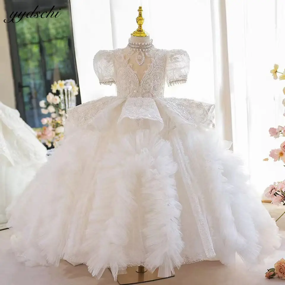 Customized Luxury Glitter Pearls Beaded Flower Girl Dresses For Wedding Shiny Sequins Appliques Princess First Communion Gowns