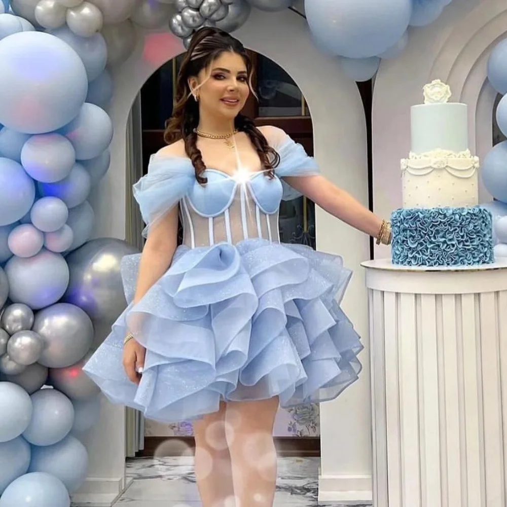 Customized Modern Style Off the Shoulder Ball Gown Pleat Ruched Tiered Knee-Length Organza Bespoke Occasion Dresses Evening