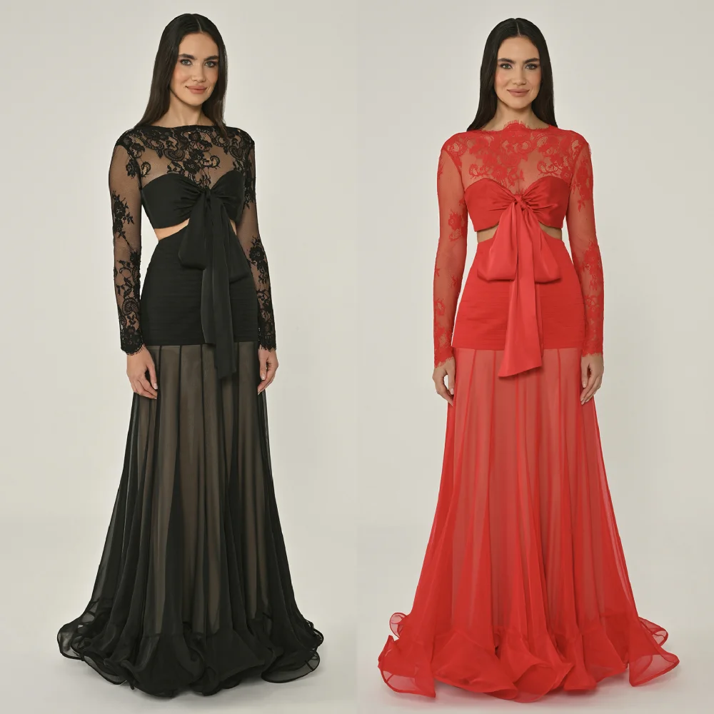Item: Customized Organza Bow Lace O-Neck A-line Long Dresses Bespoke Occasion Classic Elegant Sizes Available
