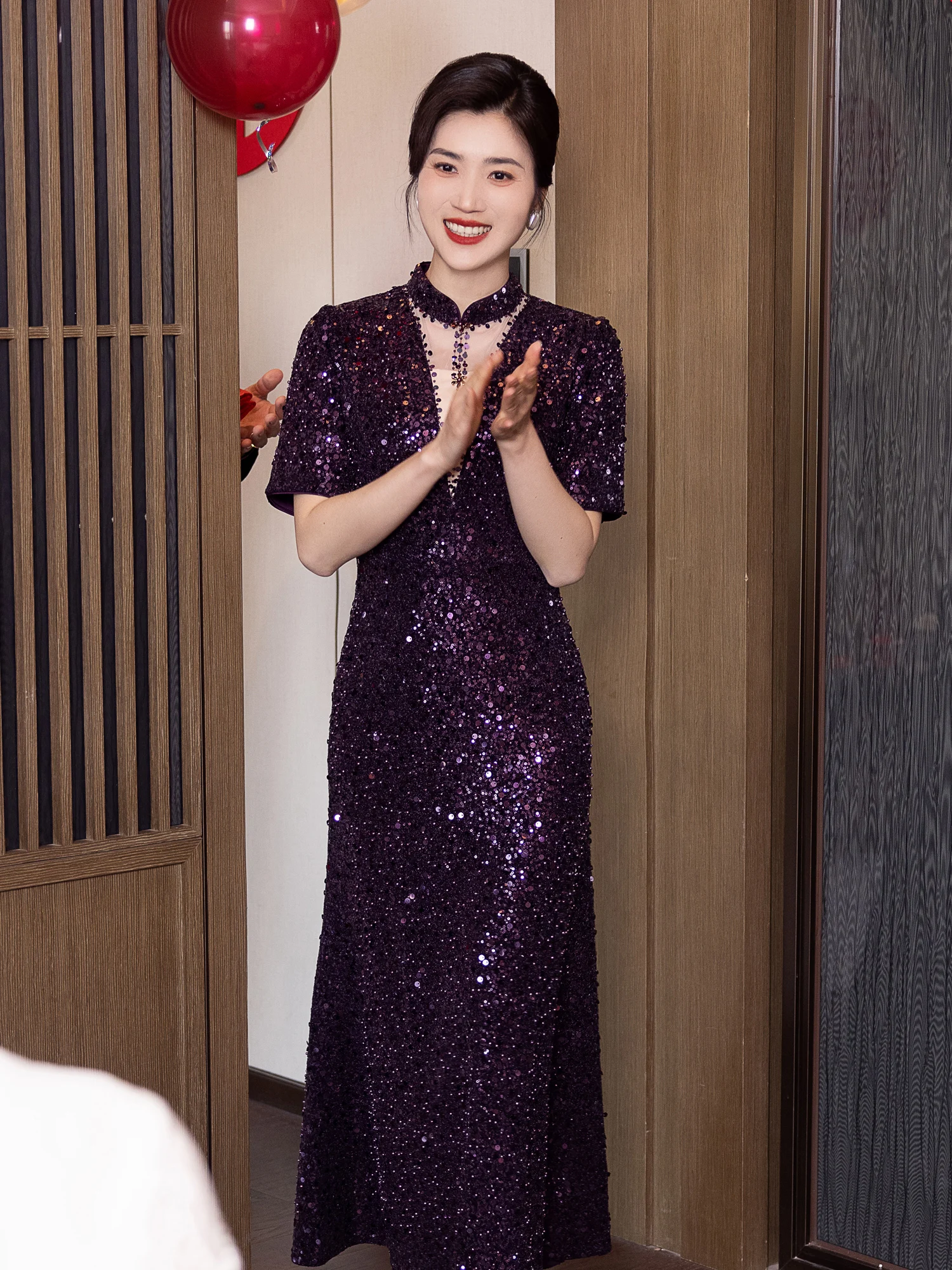 Deep Purple Mother Of The Bride Dresses Elegant V-Neck Ankle-Length Sequin Mermaid Evening Gowns For Wedding Party