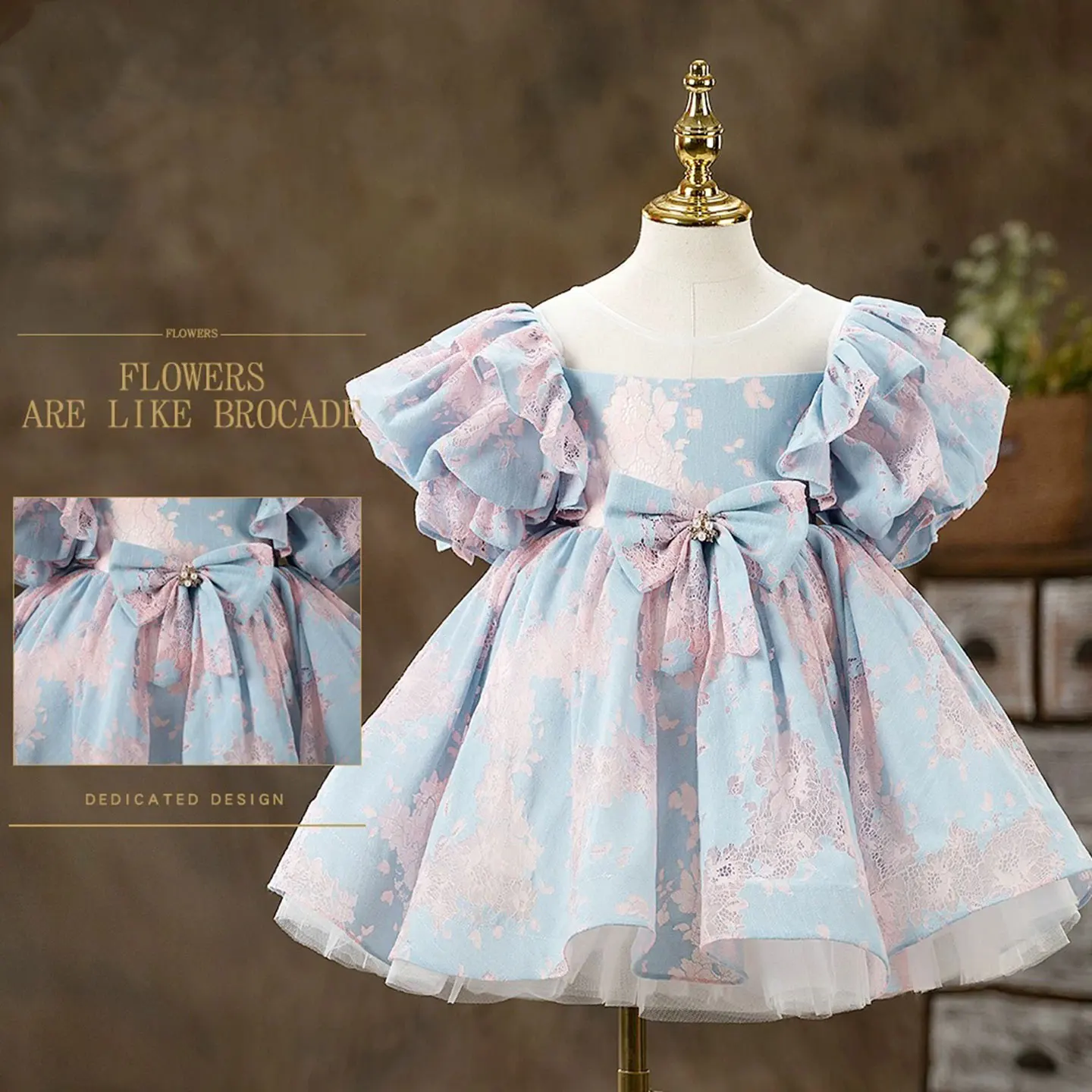 Dreamy Vow Charming Blue & Pink Baby Girl Dress Graceful Bow-adorned Short-Sleeved Kids Party Ball Gown J707