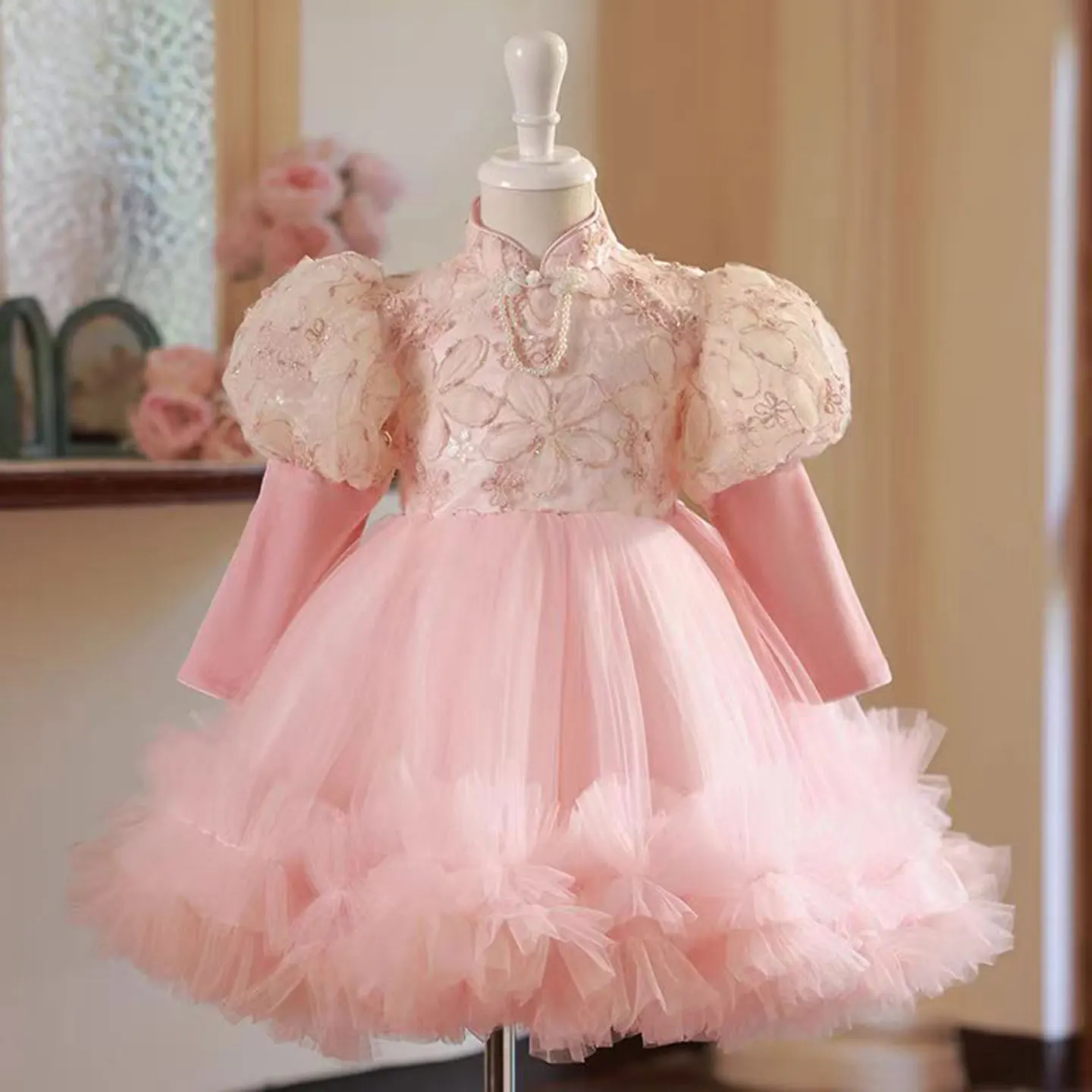 Dreamy Vow Elegant Chinese Style Neck Pearled Tulle Pink Flower Girl Dress Long Sleeves Wedding Birthday Evening Party Prom D032