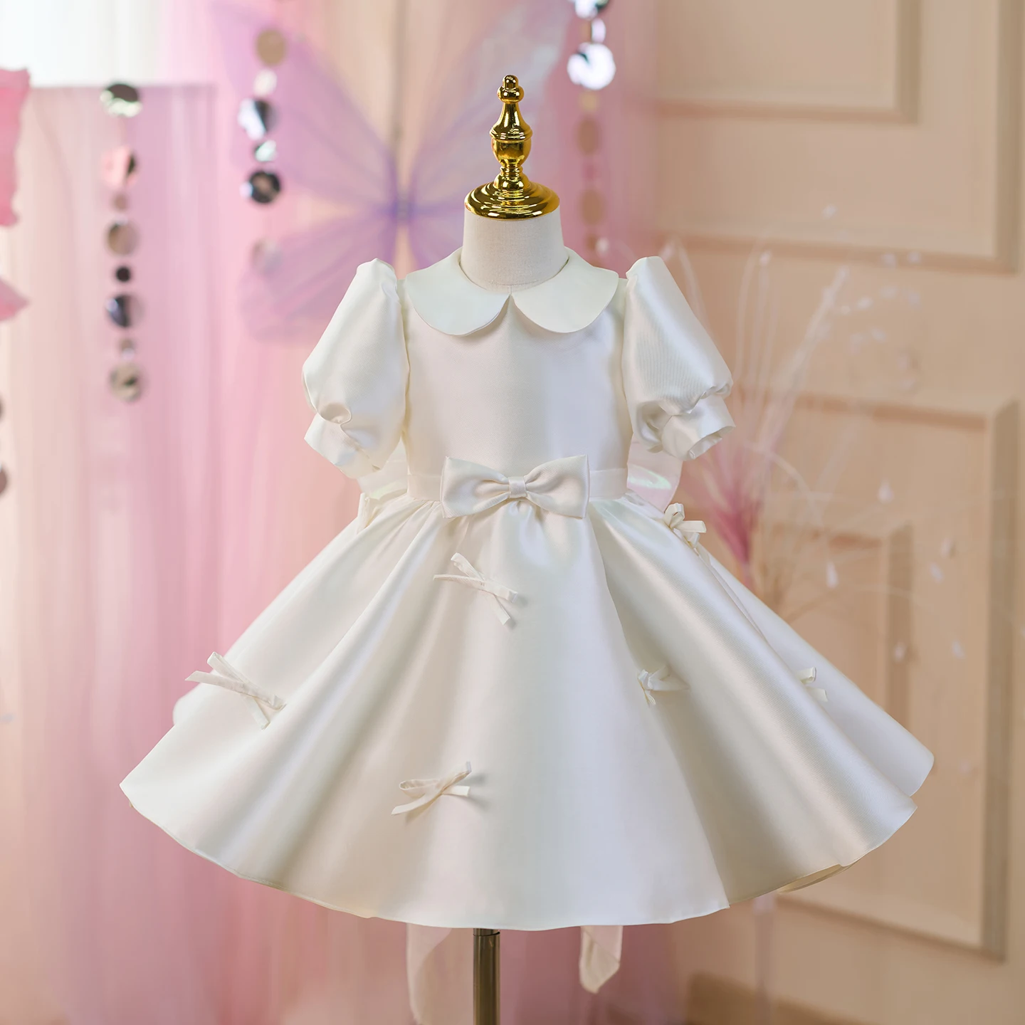 Dreamy Vow Elegant O-Neck Satin White Flower Girl Dress With Bow Short Sleeve Wedding Party First Communion Prom Ball Gown J819