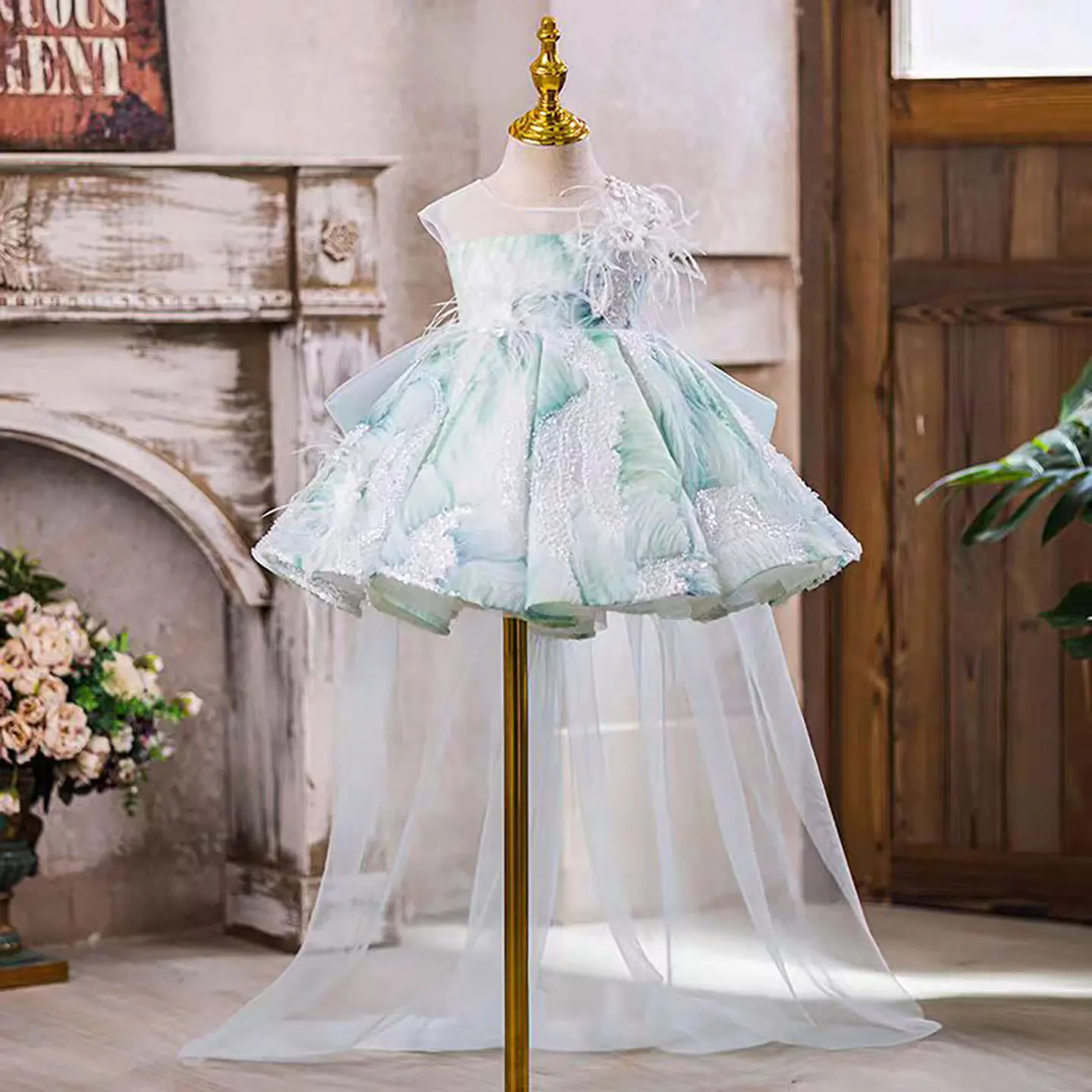 Dreamy Vow Lovely Applique Fur Flower Baby Girl Dress With Bow Train Sleeveless for Kids Wedding Birthday Party Ball Gown J545