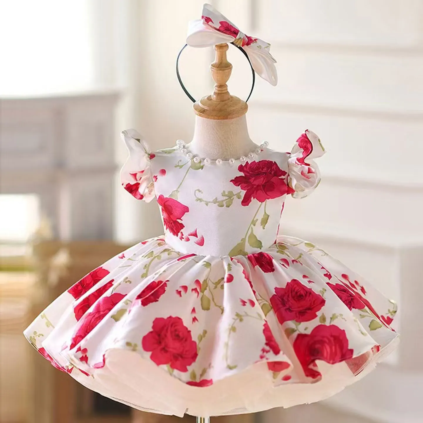 Dreamy Vow Lovely Girl Dress Short Sleeved Satin Floral for Kids Holiday Birthday Party Spring Summer Knee Length Ball Gown J051
