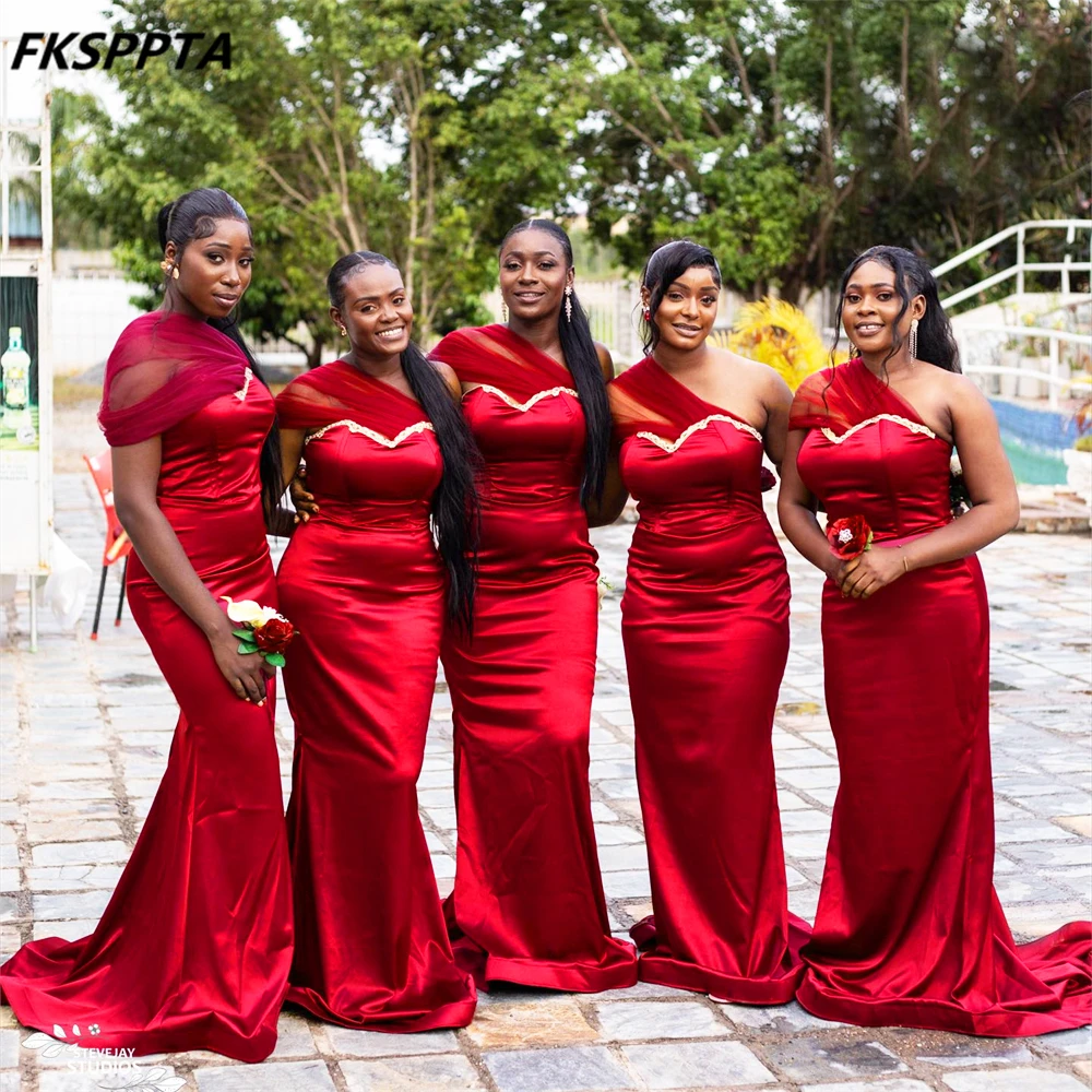 Dropshipping 2025 Burgundy Long African Bridesmaid Dresses One Shoulder Shiny Satin Wedding Guest Gowns Customized