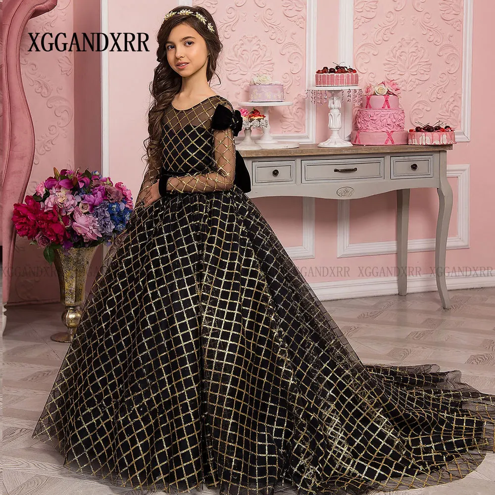 Elegant Flower Girl Black Dress 2025 Shiny Bow Back Mini Quince Birthday Party Gown Wedding Arab Daughter Princess Prom Dress