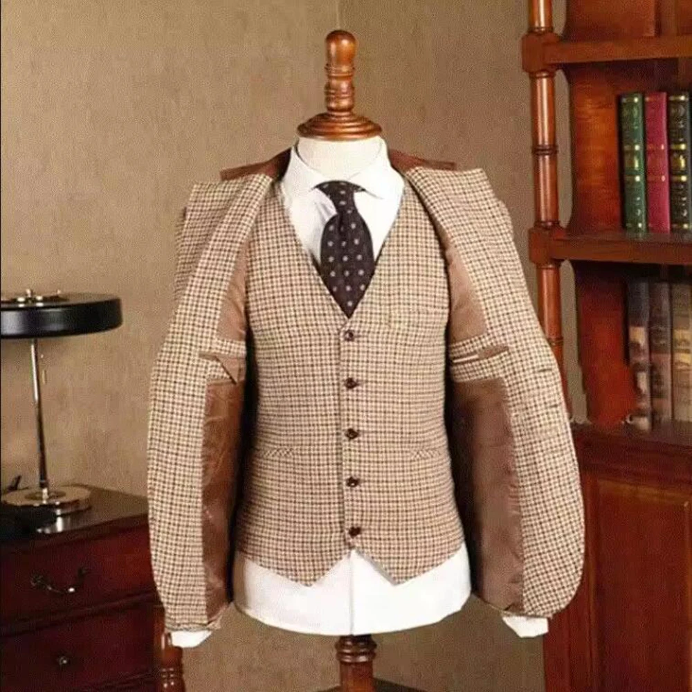 Elegant Groom Wear Wedding Tuxedo Customized Houndstooth Plaid Wool Blend Blazers Formal Business Party Suits Men Slim Fit 2025