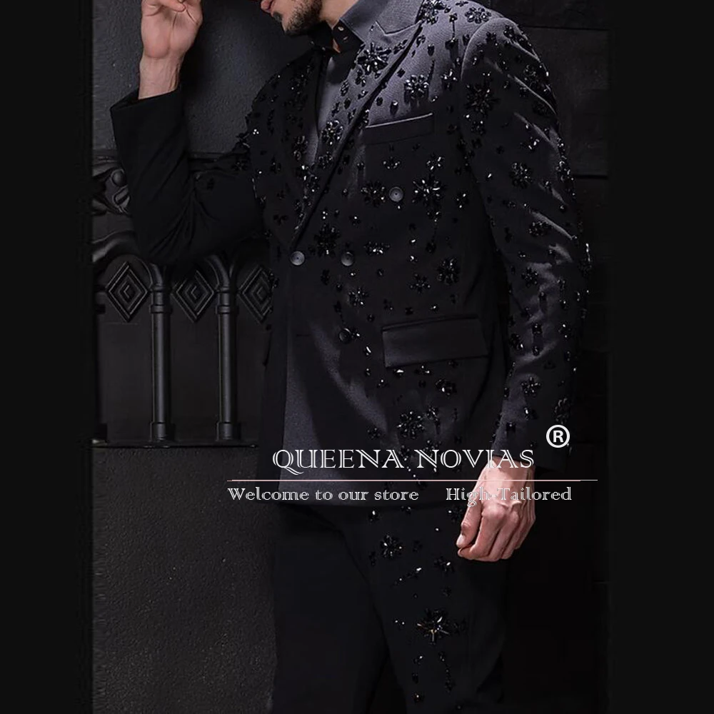 Elegant Groom Wedding Suits Gemstones Beaded Prom Blazers Customized Men’s Tuxedos Double Breasted Man 2 Pieces (Jacket Pants)