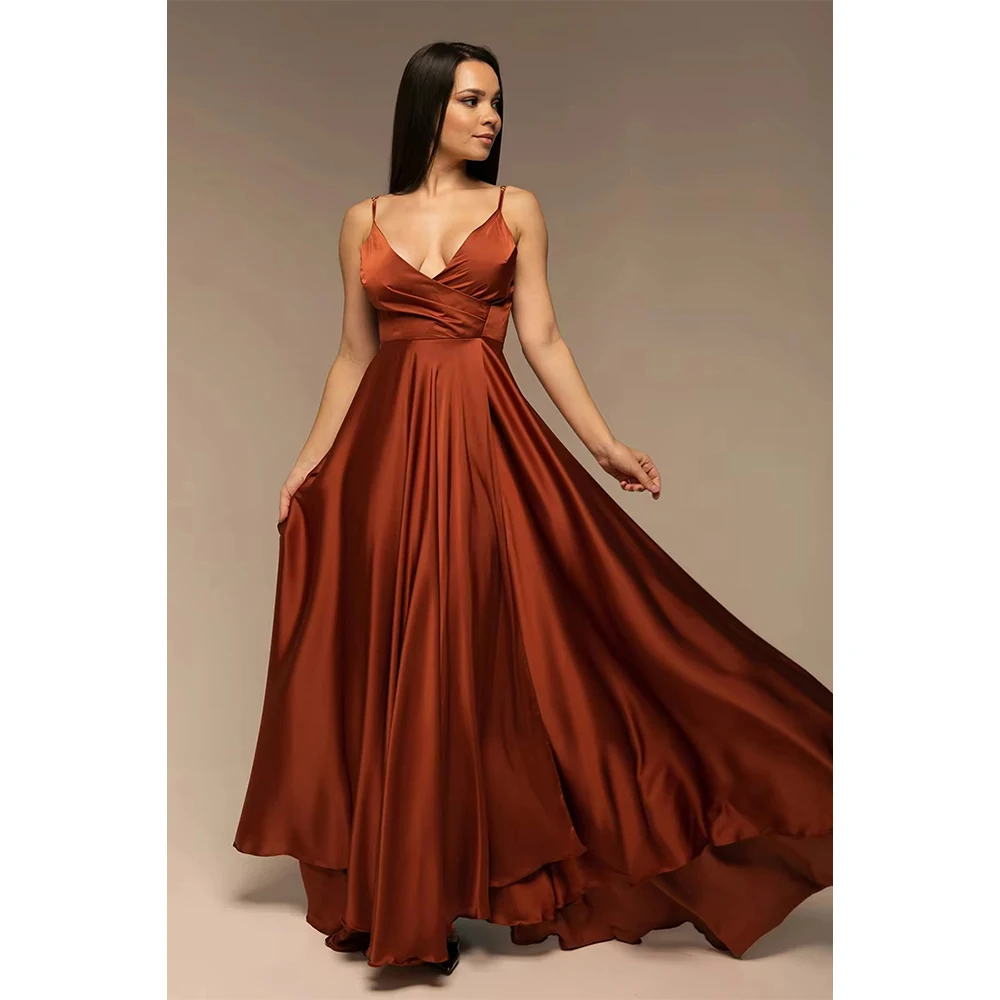 Elegant Long Prom Dresses for Women Satin V-Neck Wedding Party Gowns A-Line Spaghetti Straps Formal Dress with Slit Customized