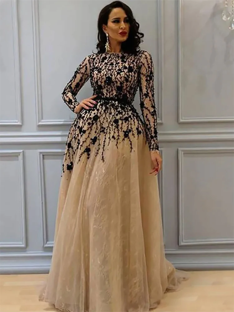 Elegant Long Sleeves A Line Lace Evening Dresses Tulle Formal Evening Dress Prom Gowns