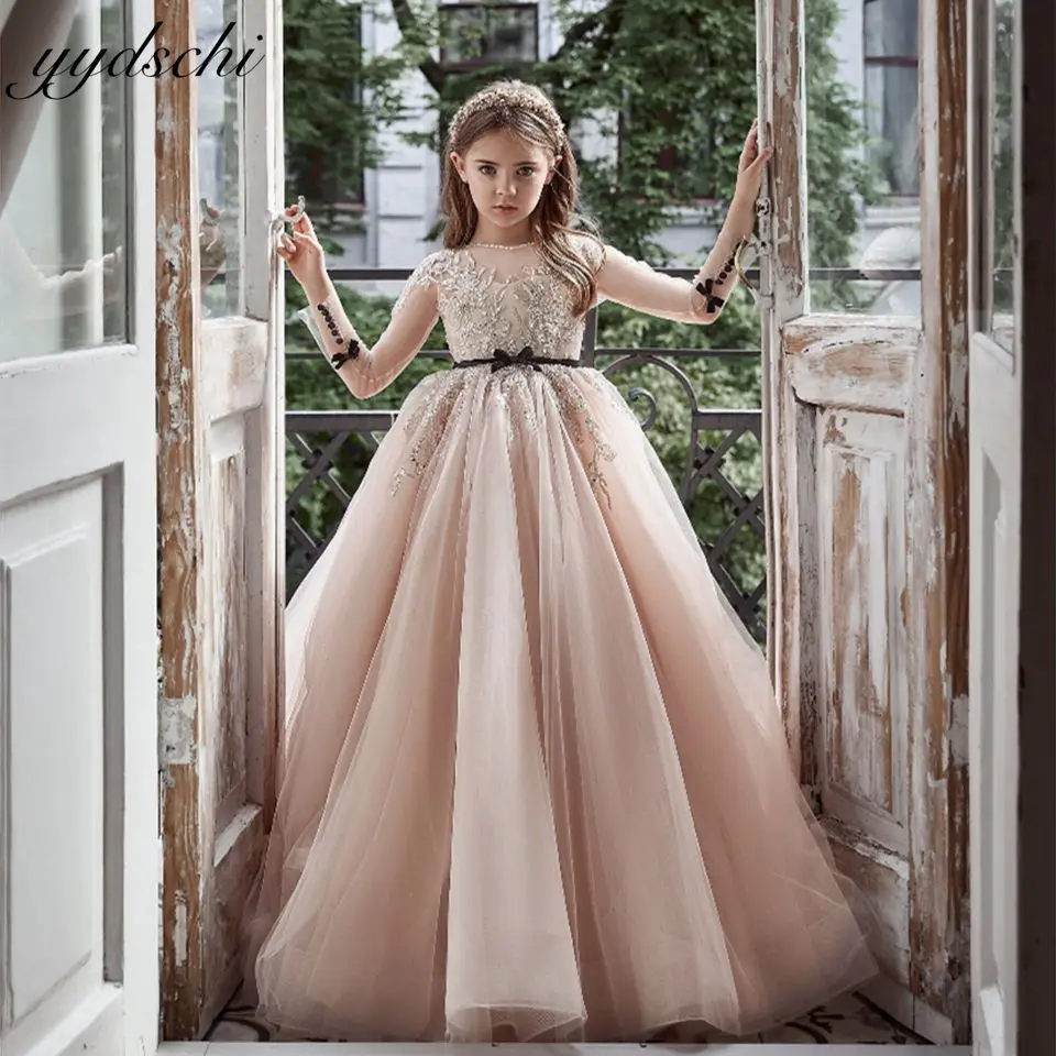 Elegant Nude Color Illusion Long Sleeves Flower Girl Dress 2025 Princess Lace Appliques Sparkle Beaded Kids First Communion Gown
