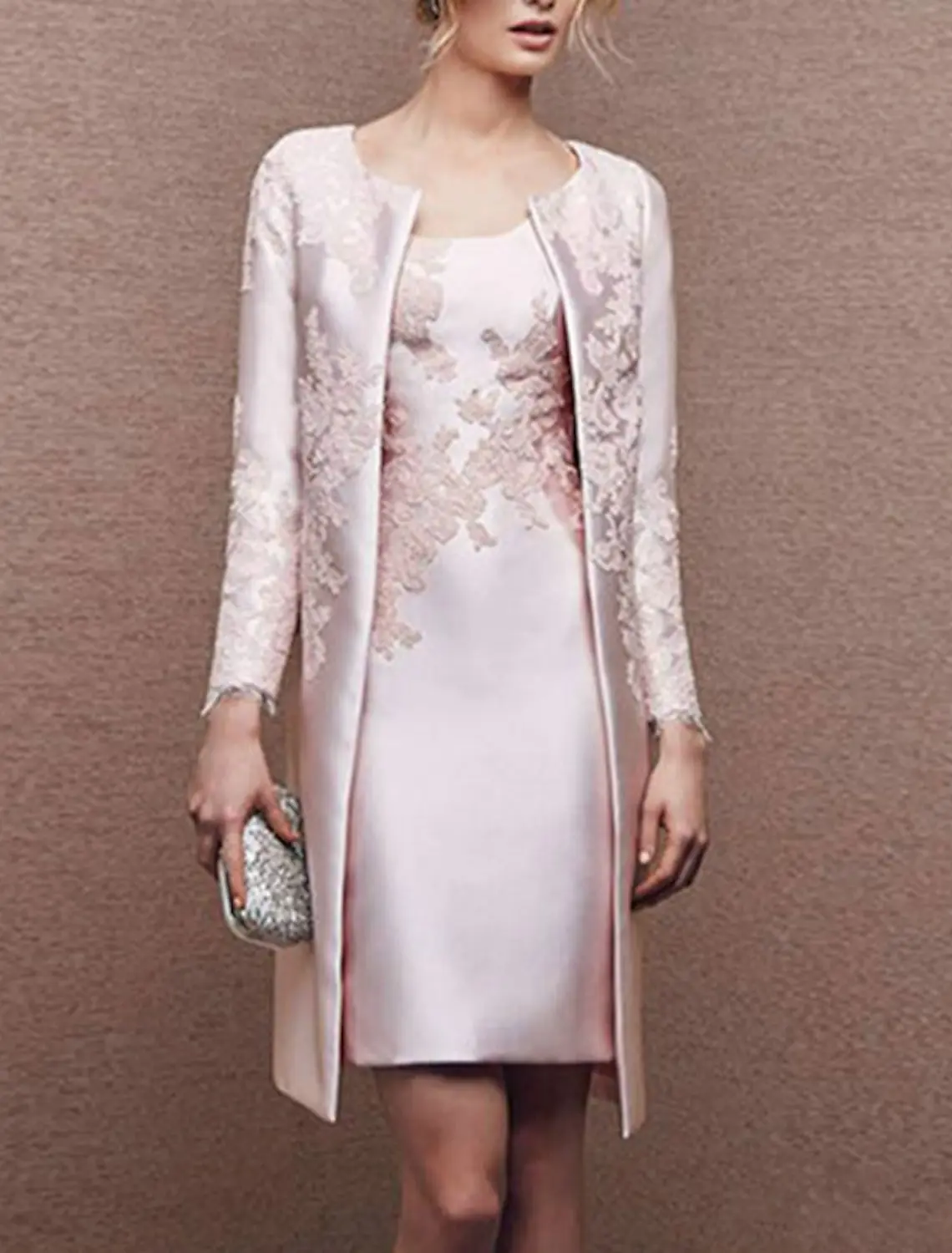 Elegant Pink Scoop-Neck Knee-Length Satin Lace Long Sleeve Jacket Mother of the Bride Dress Wedding Guest Formal Occasion