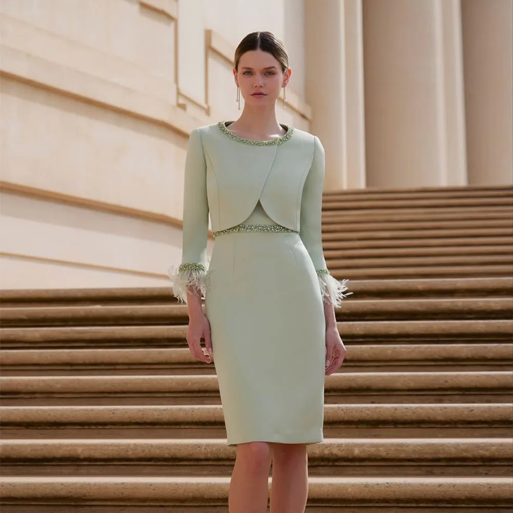 Elegant Two Piece Knee Length Sage Satin Mother of the Bride Dresses for Weddings Beading Formal Evening Party Dresse With Coat