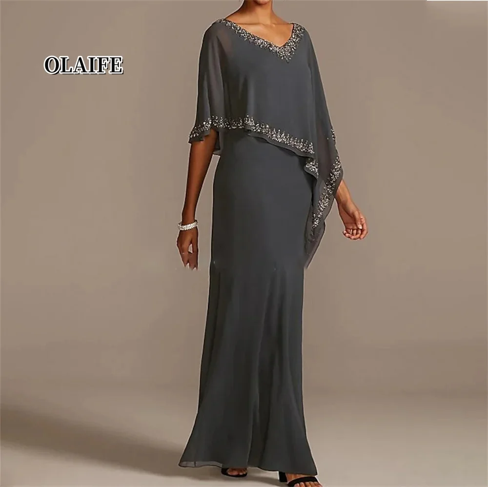 Elegant V-Neck Mother Of The Bride Dress Half Sleeve Chiffon A-line With Beading Formal Dresses Vestidos Mae Da Noiva Casamentos